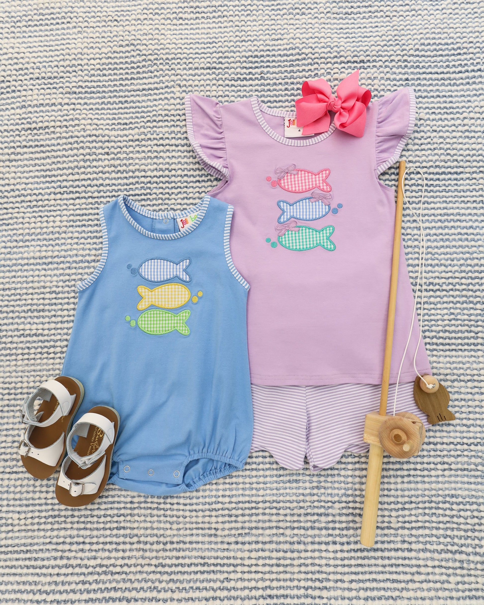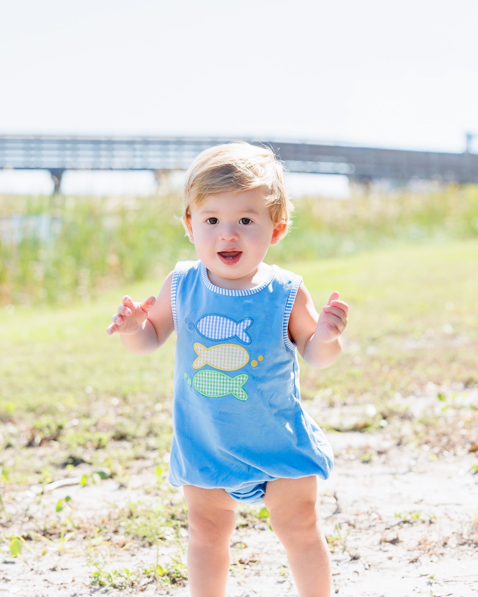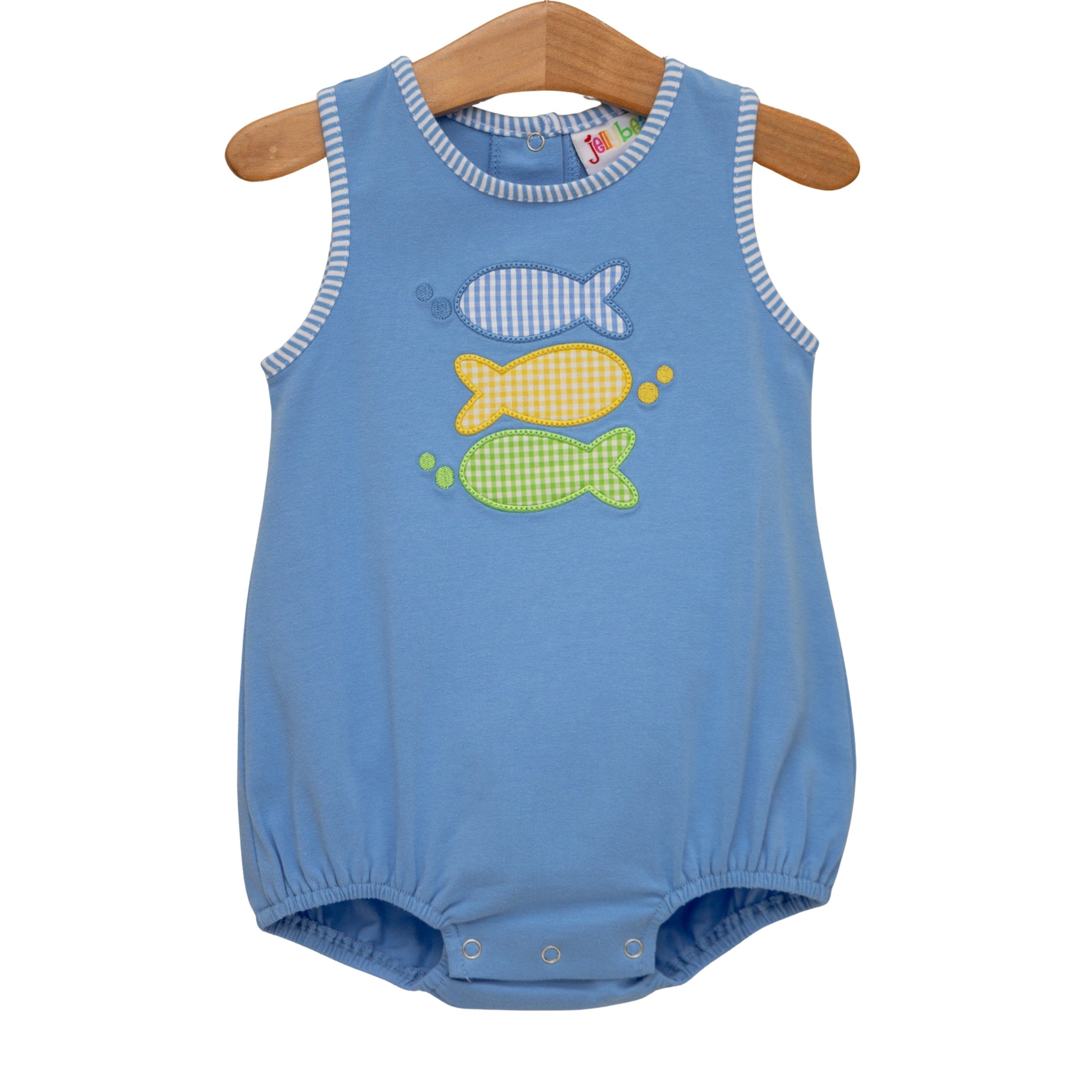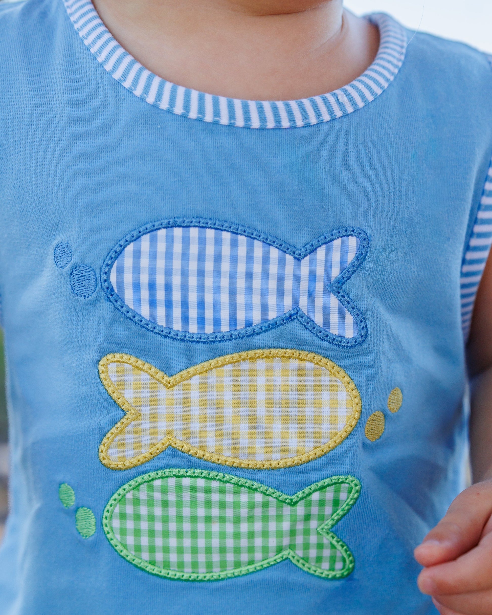 - 3 gingham print fish applique on a blue sleeveless bubble