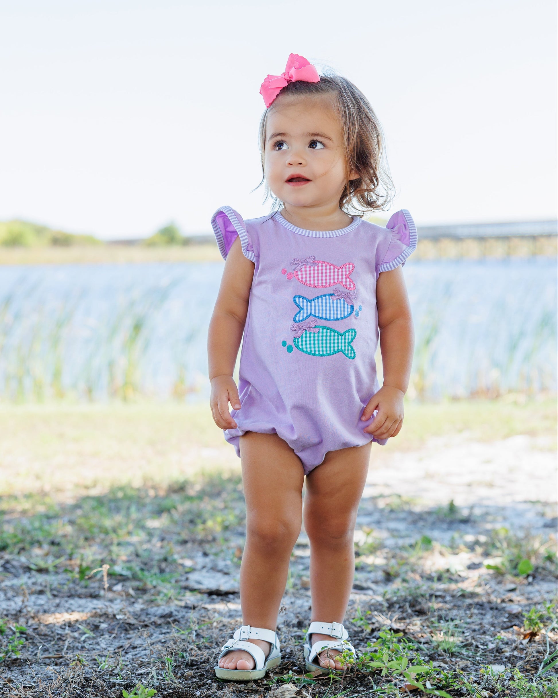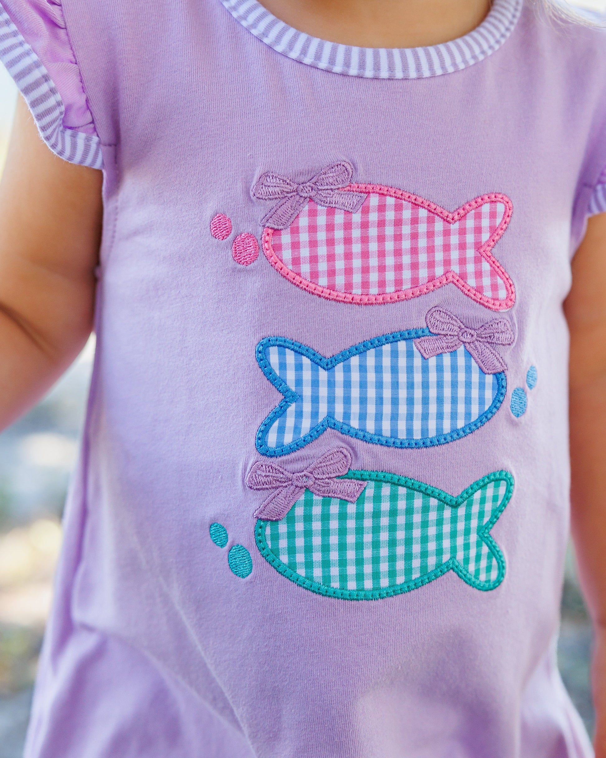 - 3 gingham print fish applique on a lavender sleeveless bubble