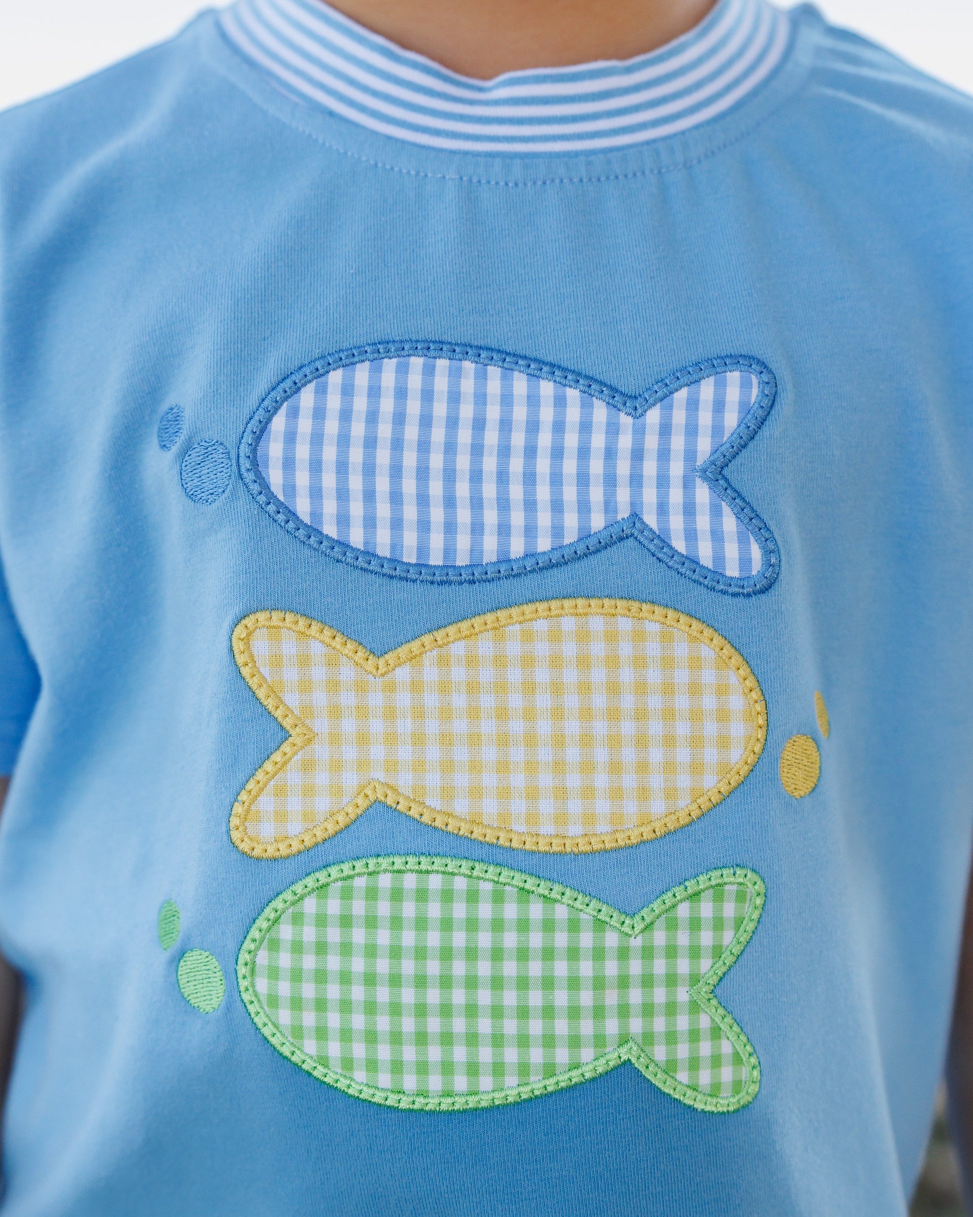 - Blue short sleeve shirt with 3 gingham print fish applique
